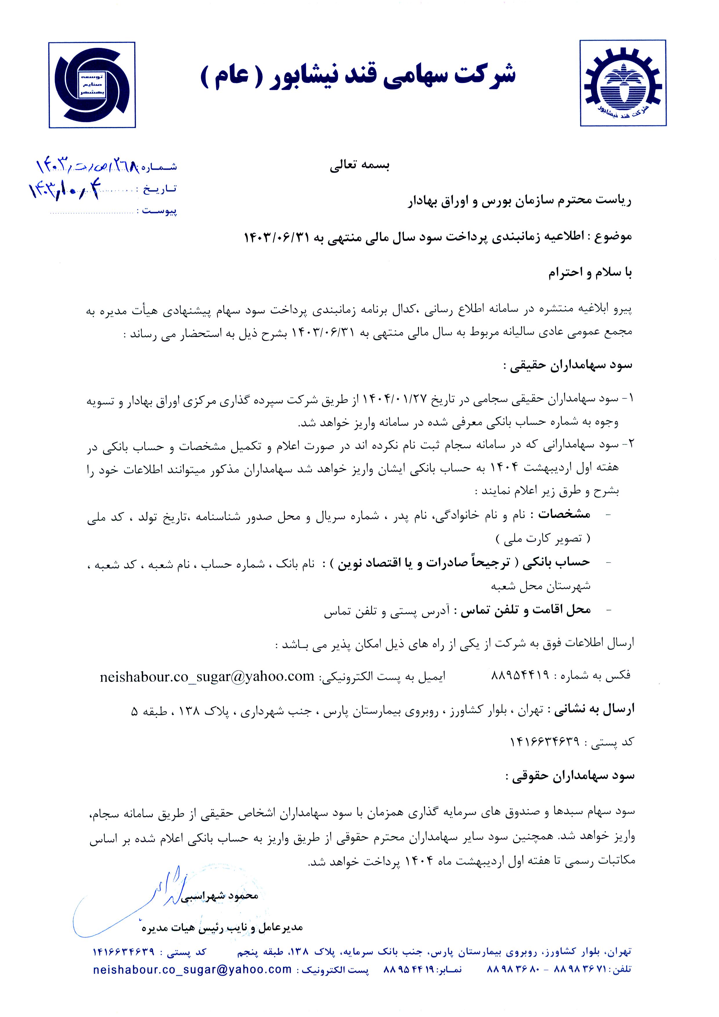 اطلاعیه زمانبندی پرداخت سود سال مالی منتهی به 31شهریور1403