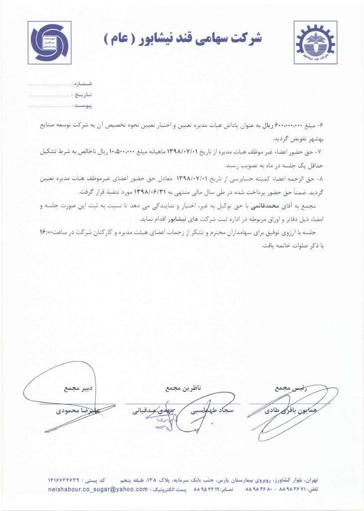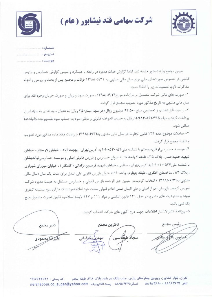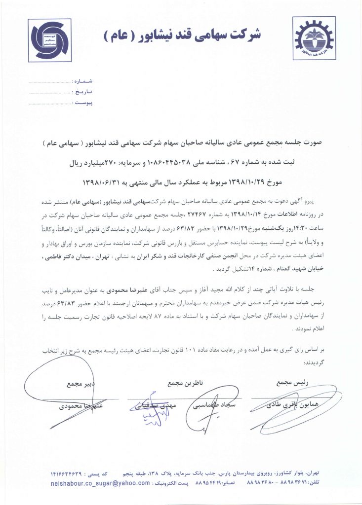 صورتجلسه مجمع عمومی عادی سالیانه صاحبان سهام شرکت سهامی قند نیشابور(سهامی عام) مورخ ۱۳۹۸/۱۰/۲۹ مربوط به عملکرد سال مالی منتهی به ۱۳۹۸/۰۶/۳۱