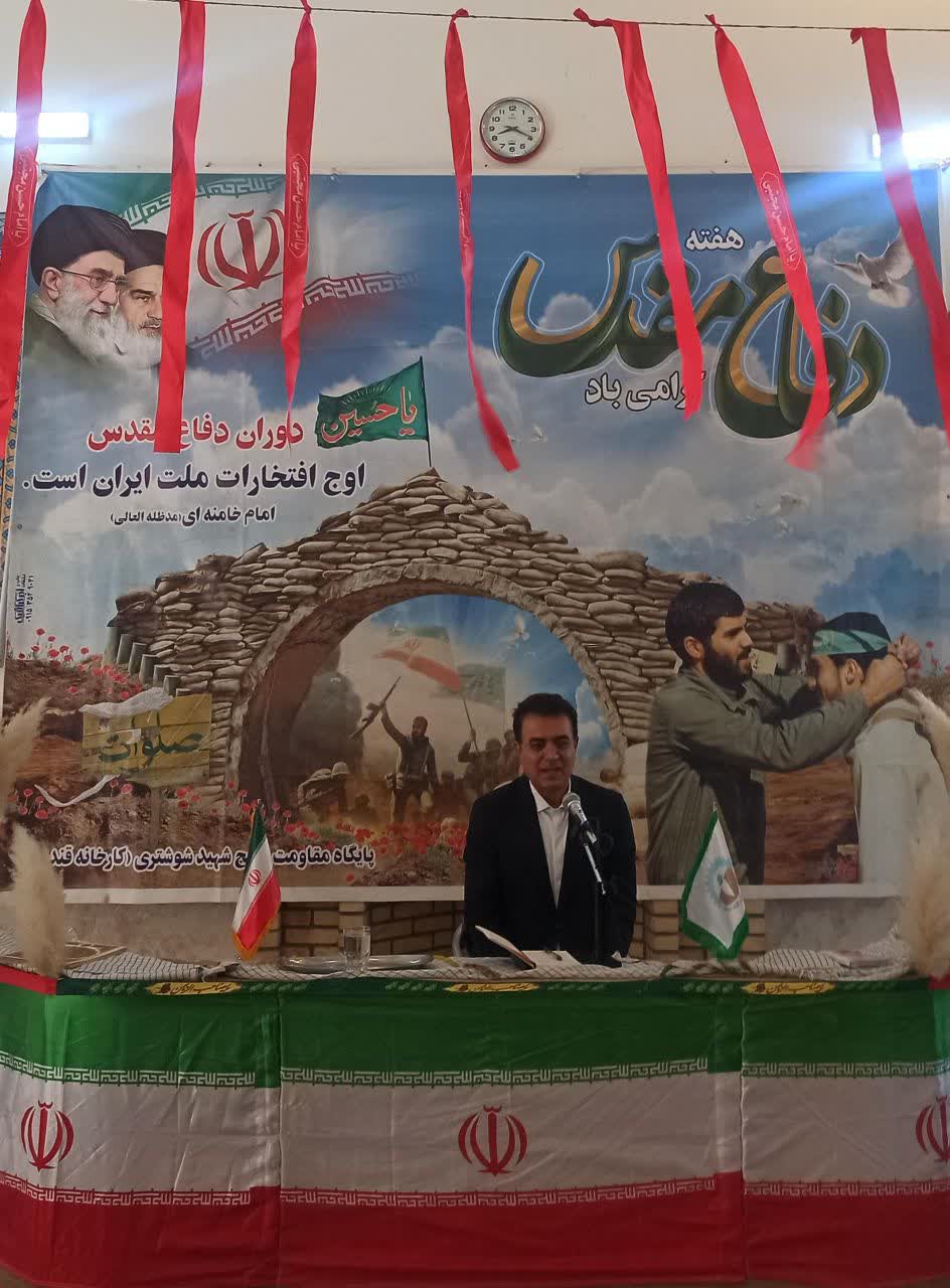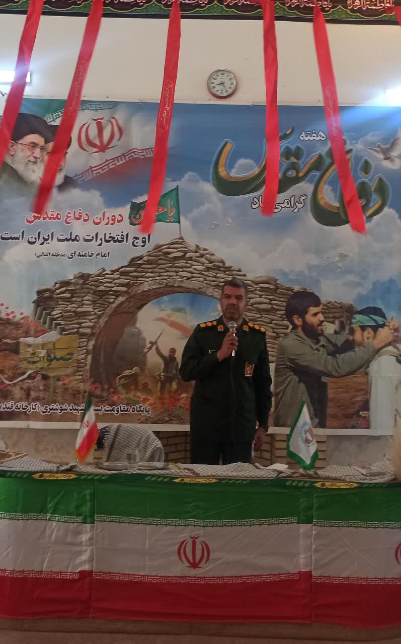 در ادامه مراسم ، فرماندهی محترم سپاه شهرستان علی رستمی نیز با تبریک هفته دفاع مقدس از زحمات مدیریت محترم کارخانه و تلاش کارگران کارخانه تقدیر نموده