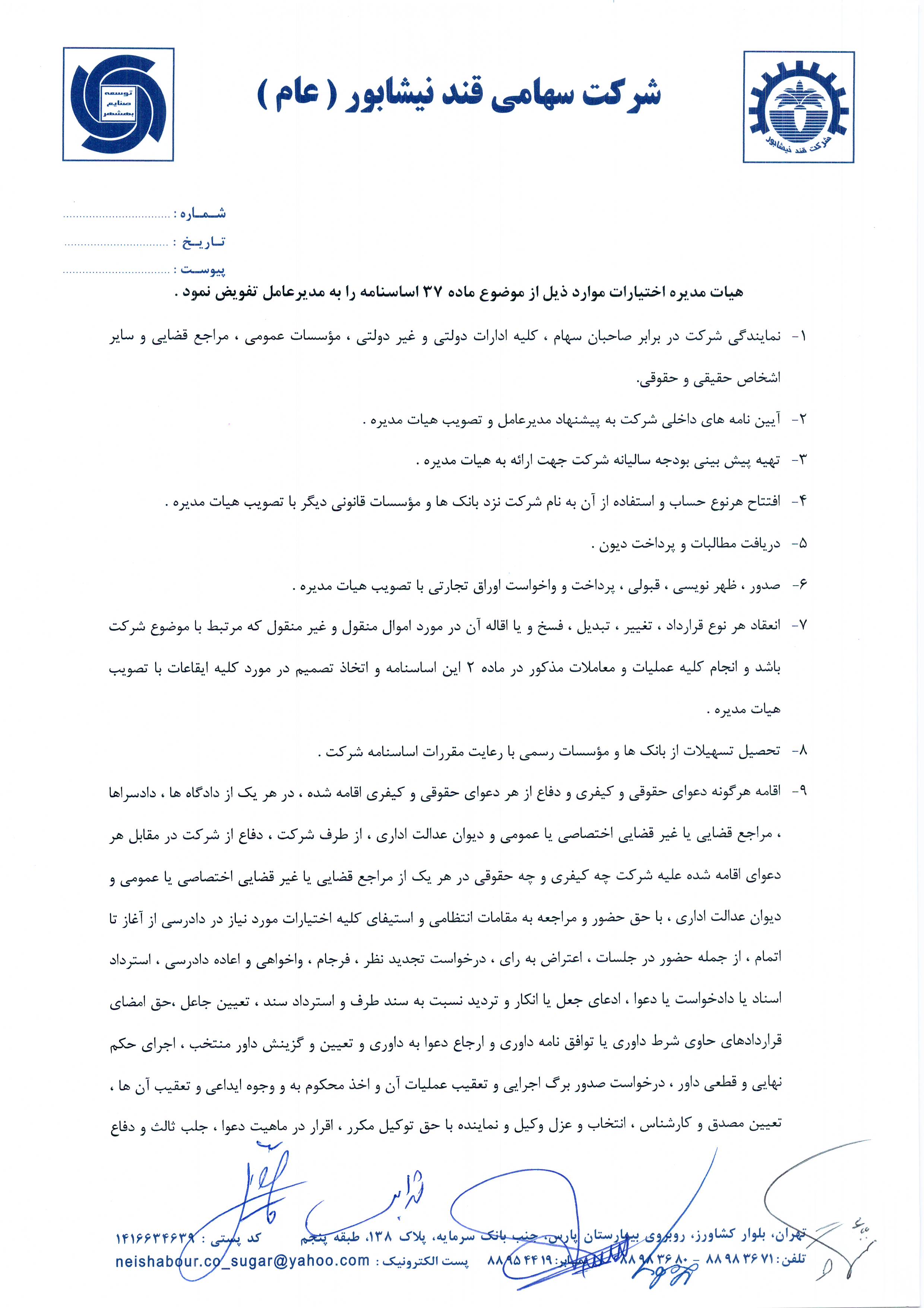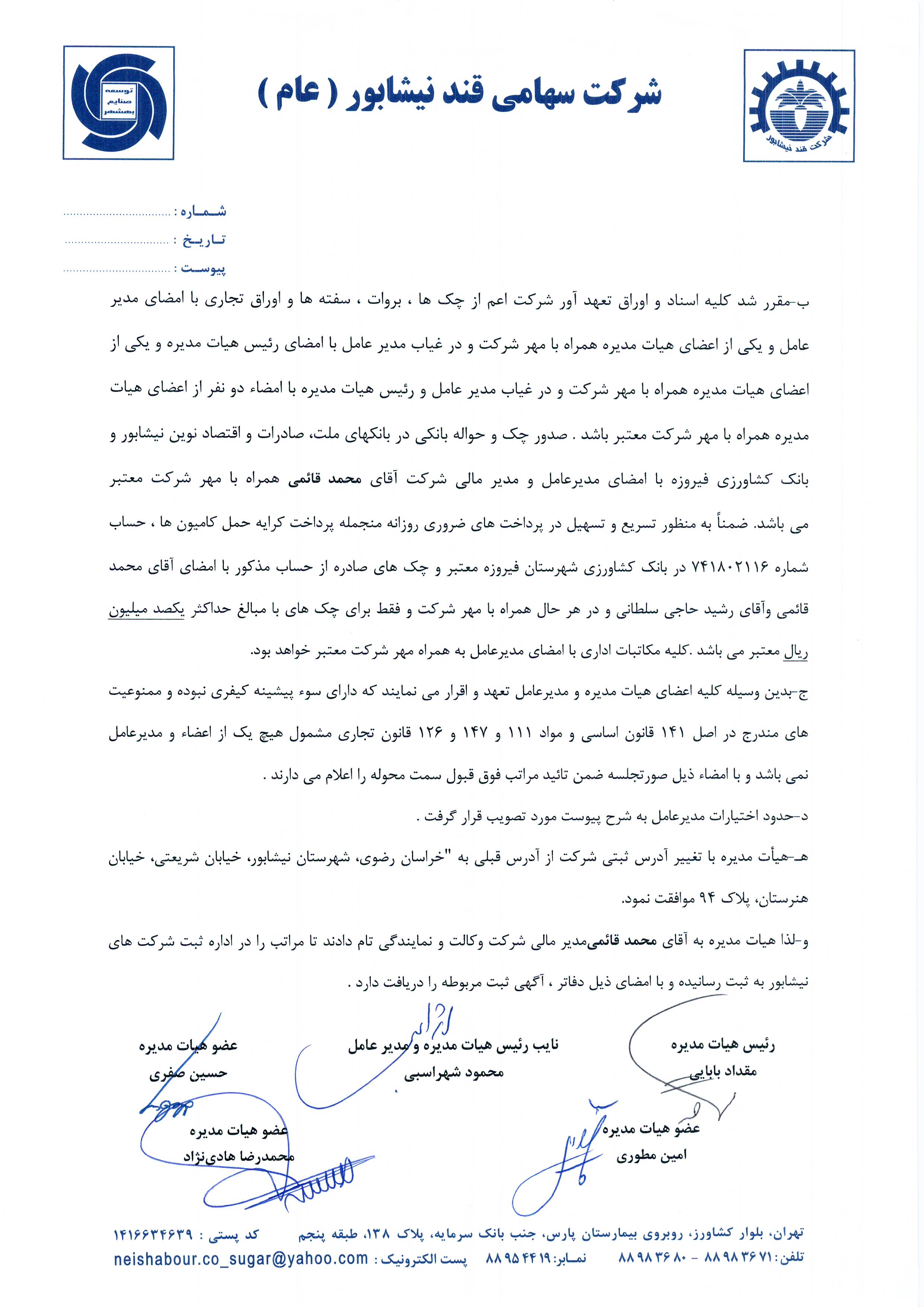 صورتجلسه هیئت مدیره شرکت قند نیشابور مورخ 99/04/31