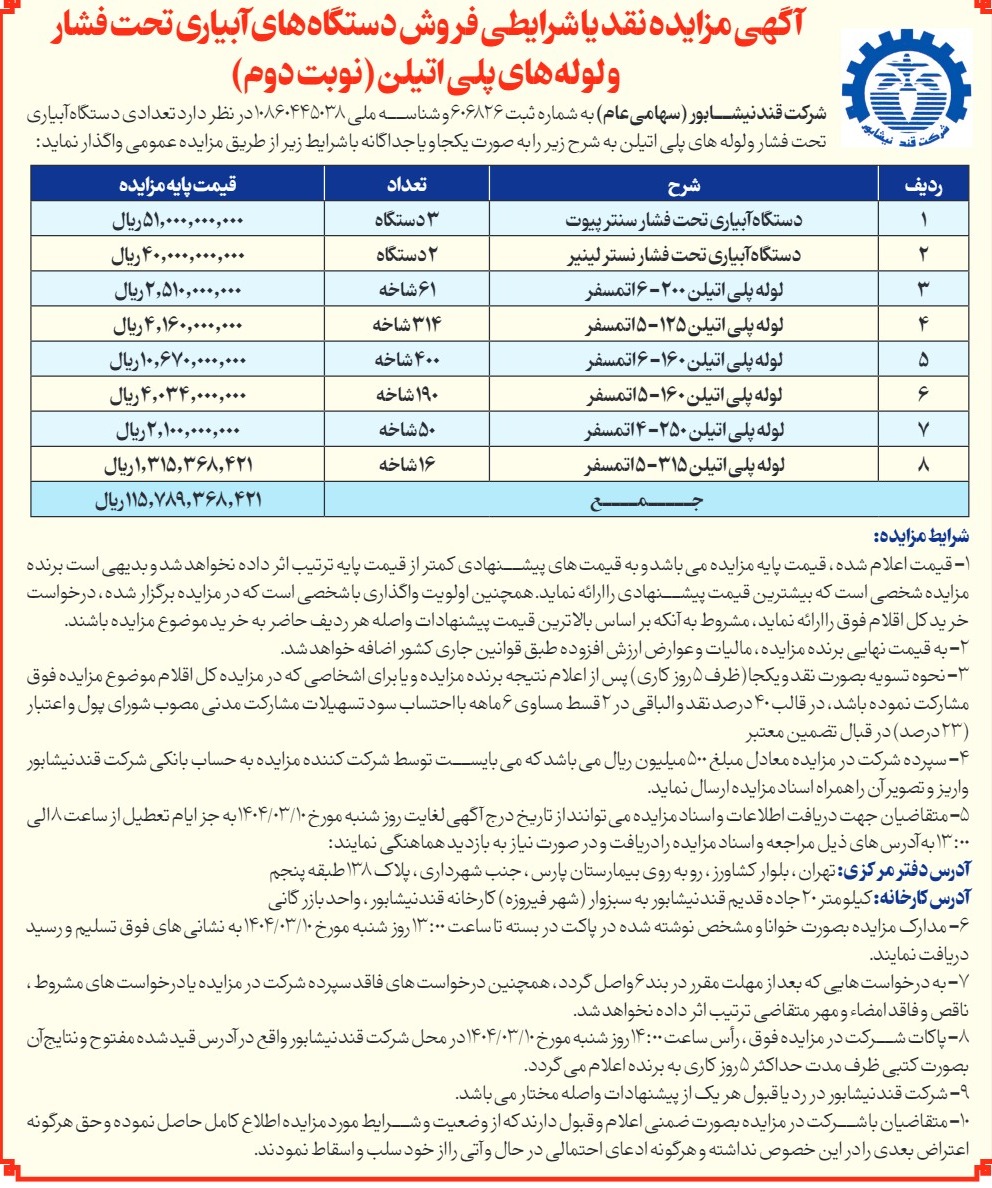 آگهی مزایده واگذاری دستگاههای آبیاری تحت فشار و لوله های پلی اتیلن شرکت قند نیشابور نوبت دوم