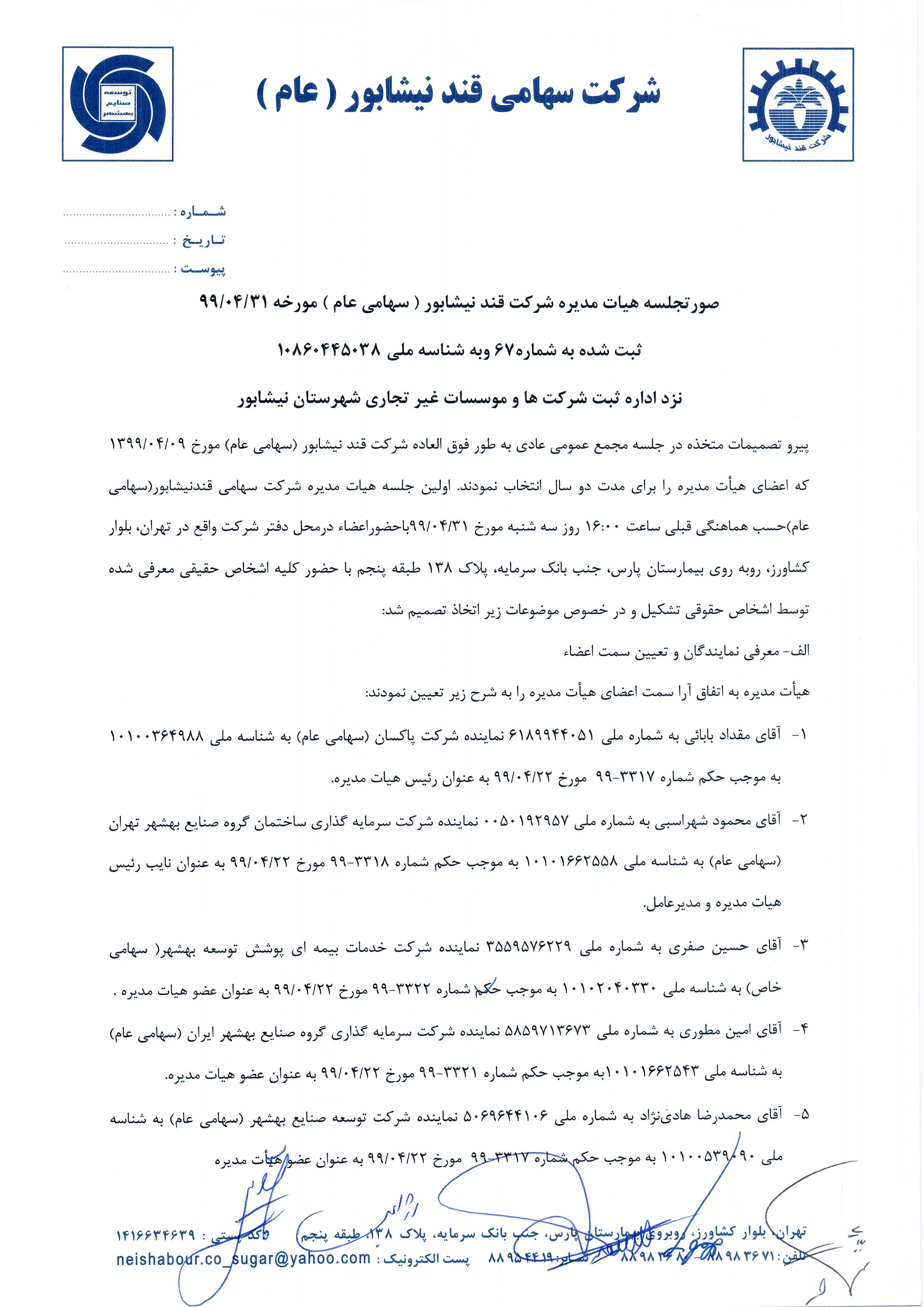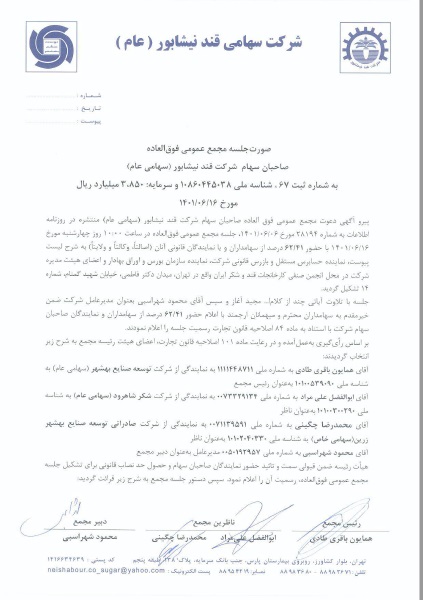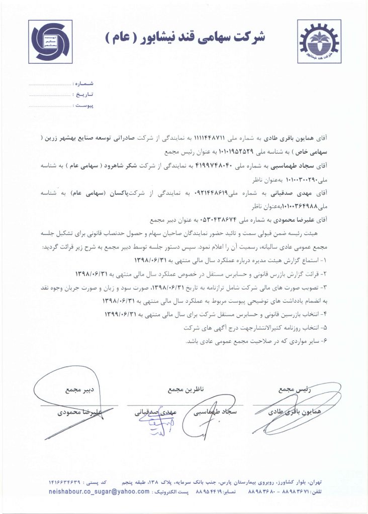 صورتجلسه مجمع عمومی عادی سالیانه صاحبان سهام شرکت سهامی قند نیشابور(سهامی عام) مورخ ۱۳۹۸/۱۰/۲۹ مربوط به عملکرد سال مالی منتهی به ۱۳۹۸/۰۶/۳۱ تصاویر متن صورتجلسه به پیوست می باشد