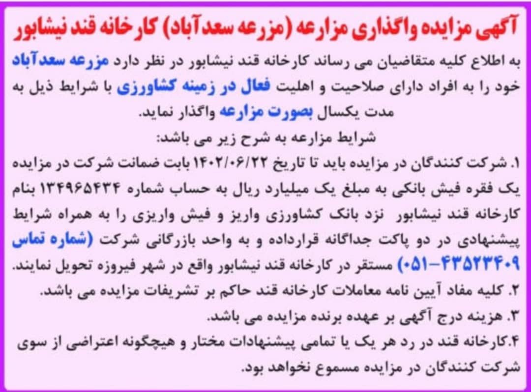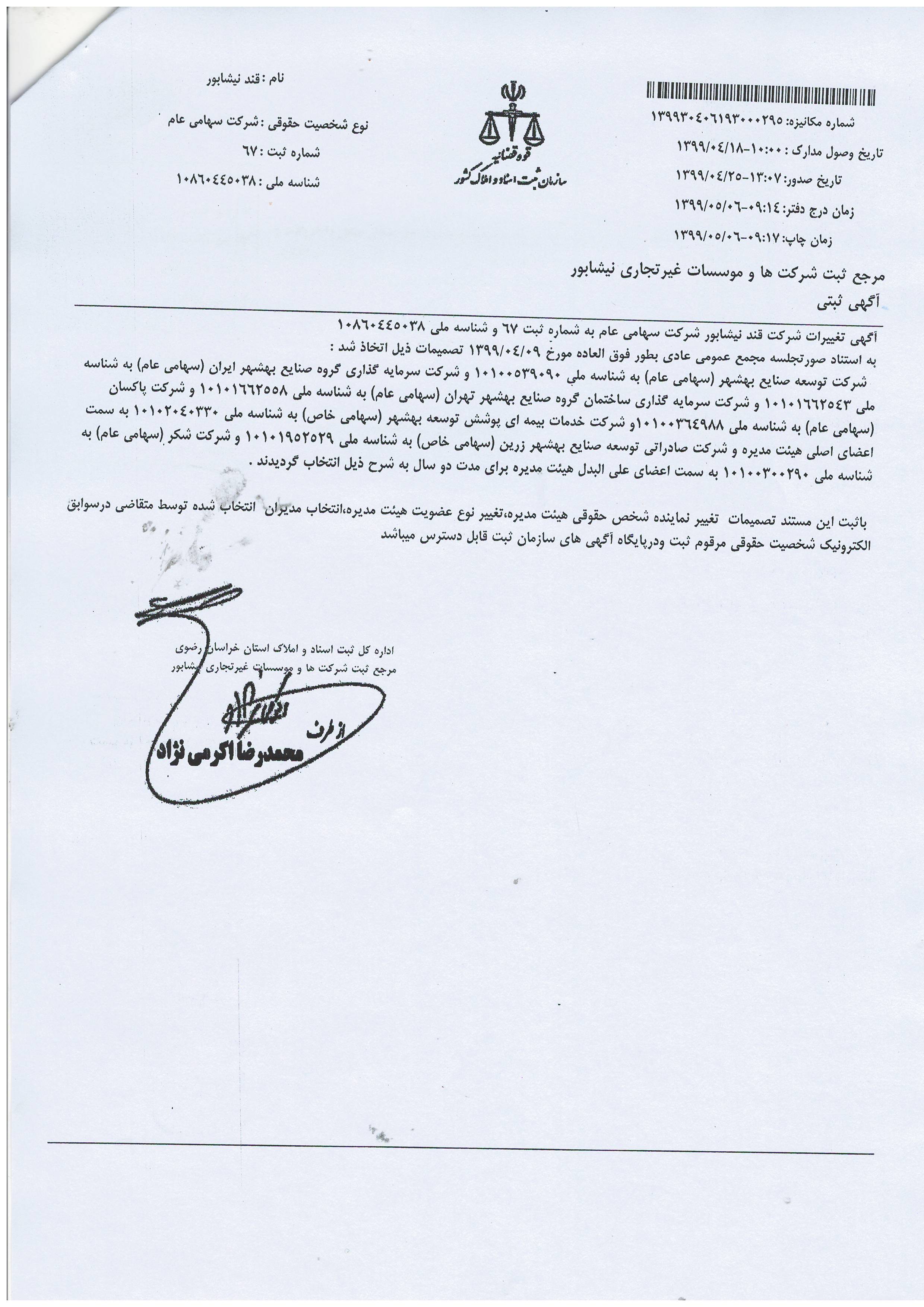 برگزاری مجمع عمومی سالیانه صاحبان سهام شرکت قند نیشابور در مورخه ۲۹ دیماه ۹۸