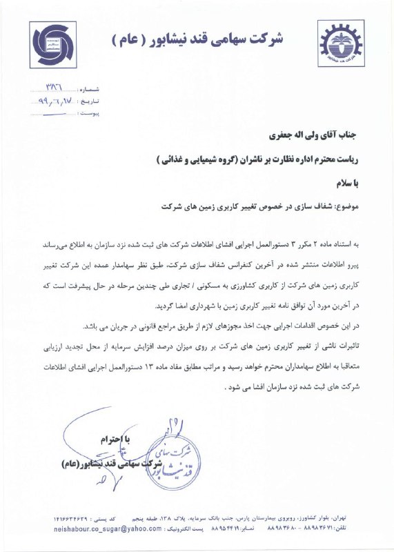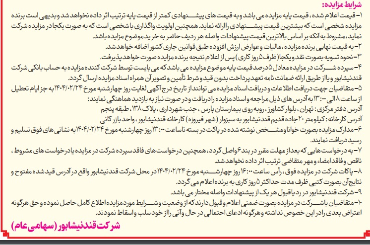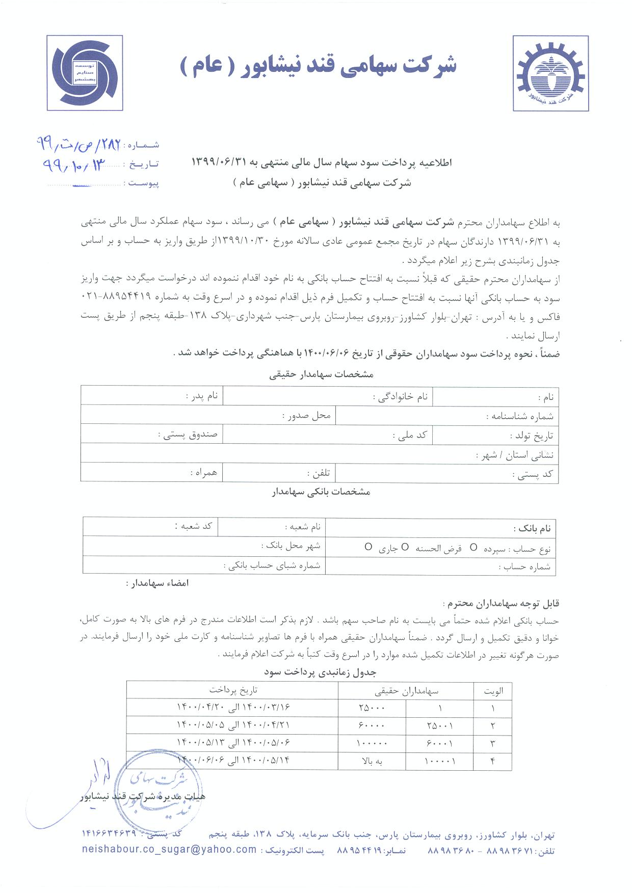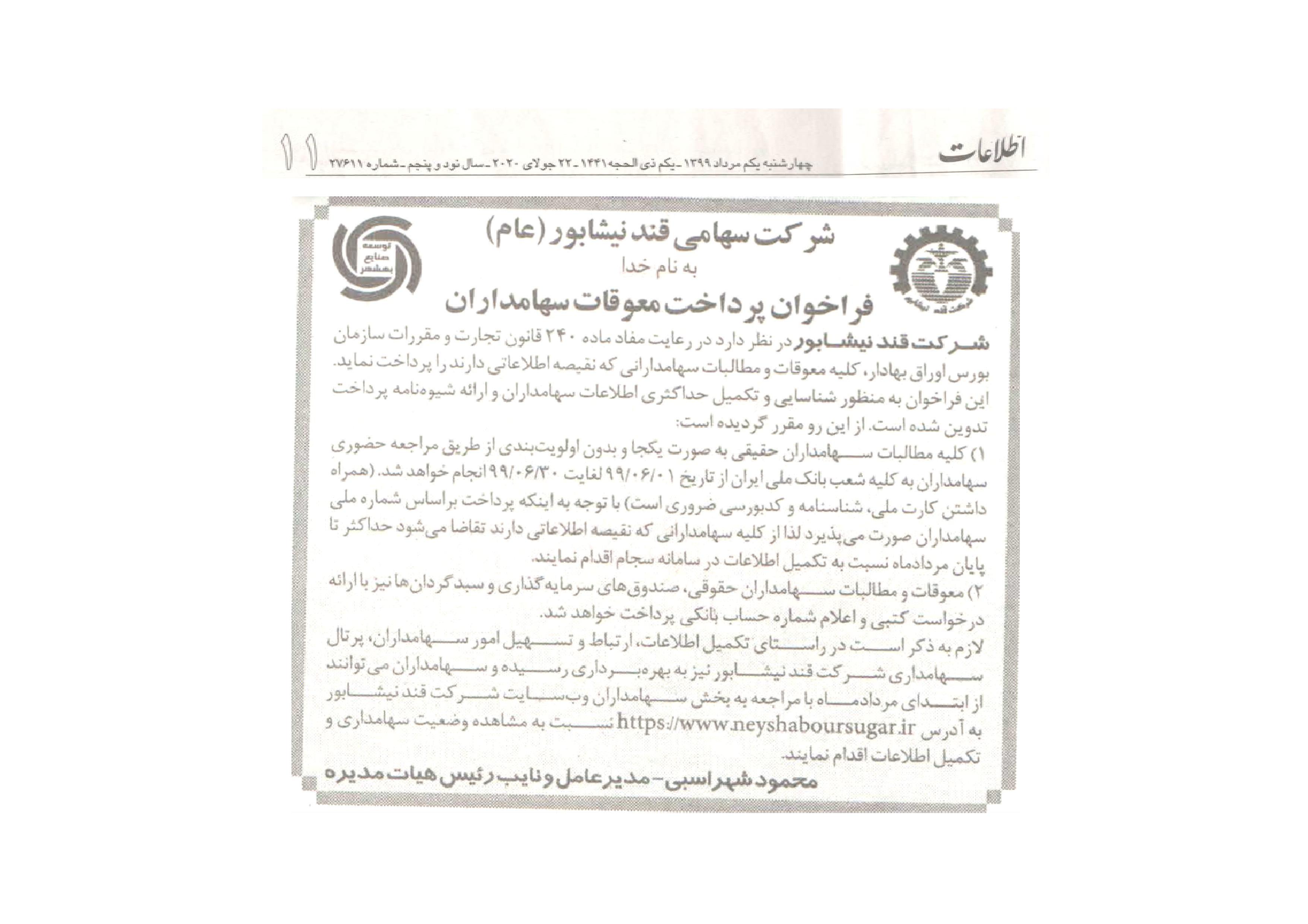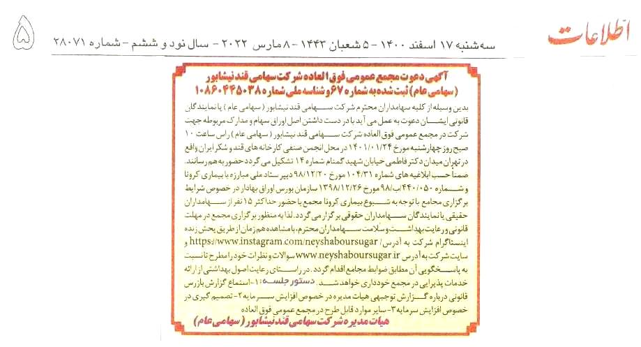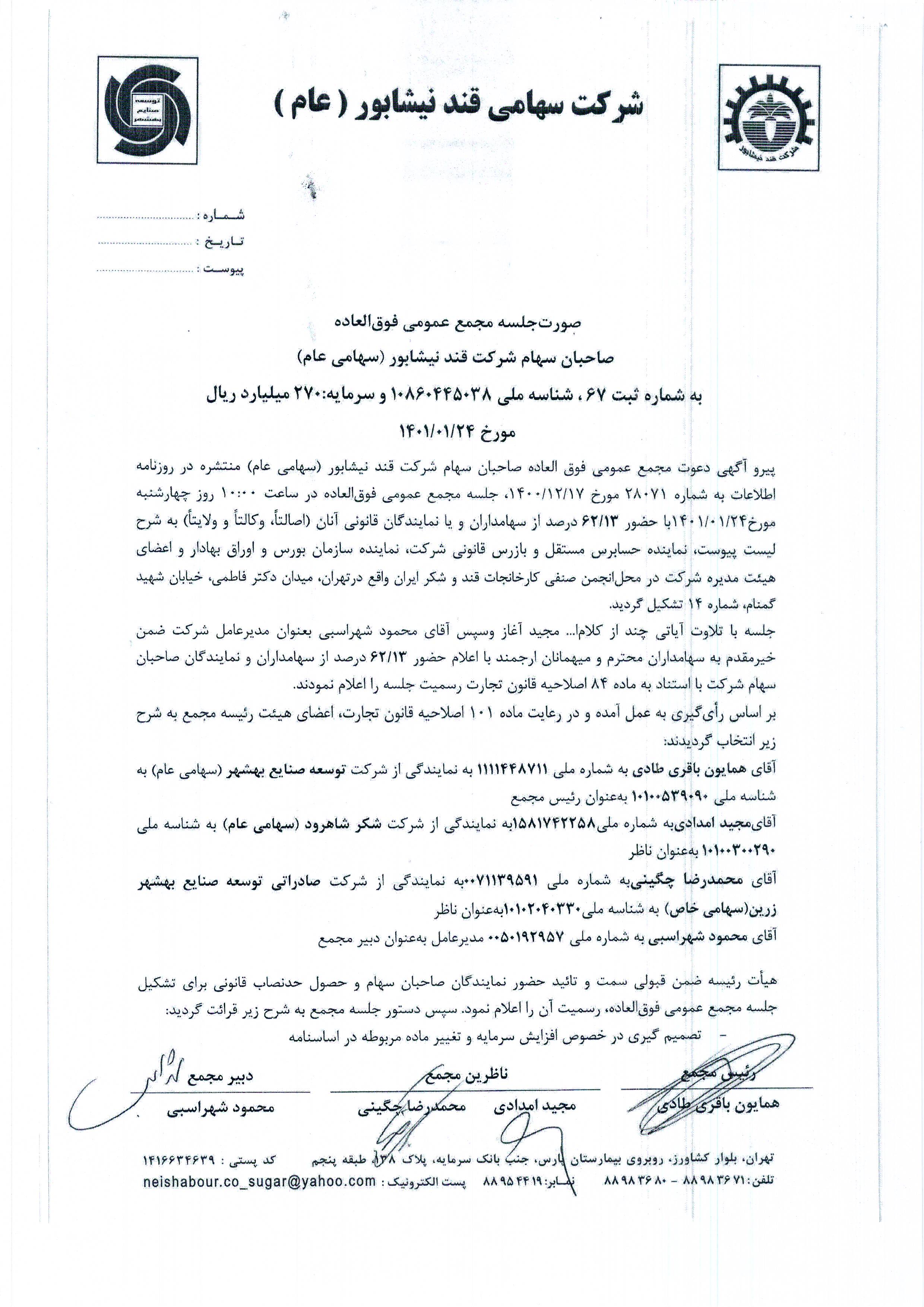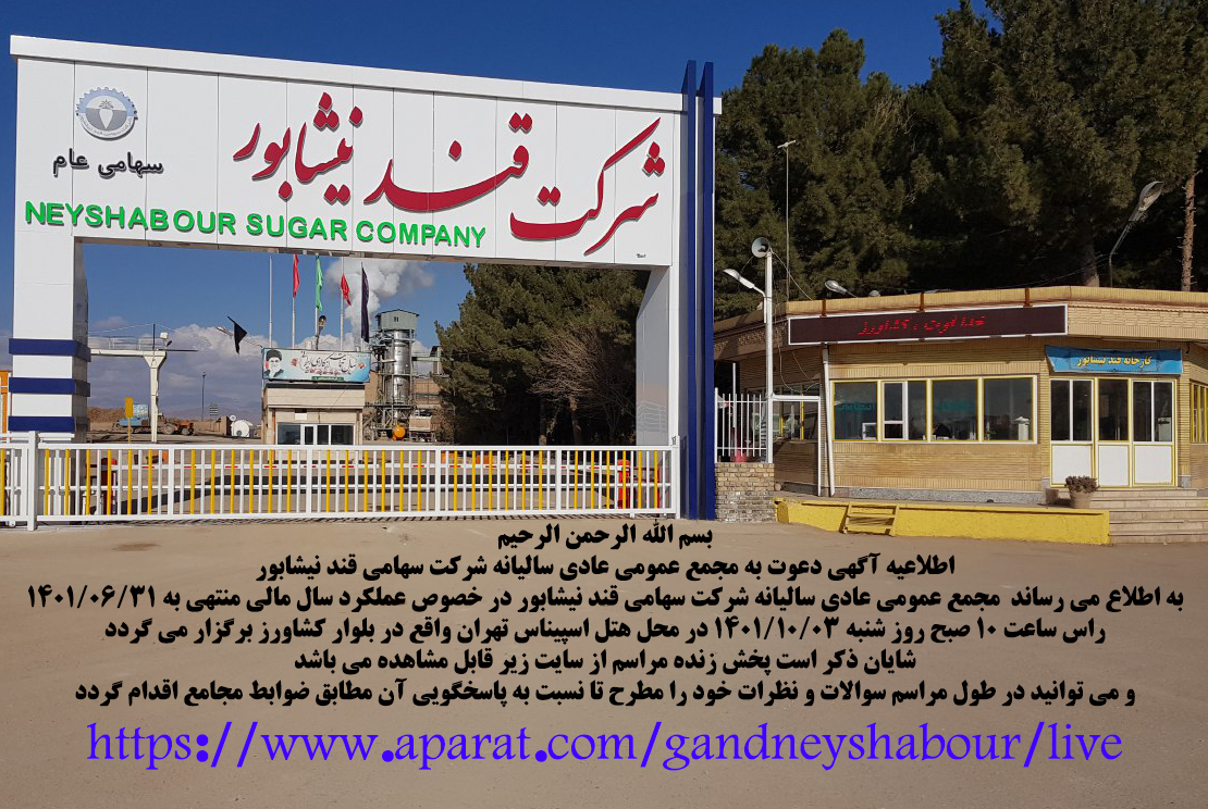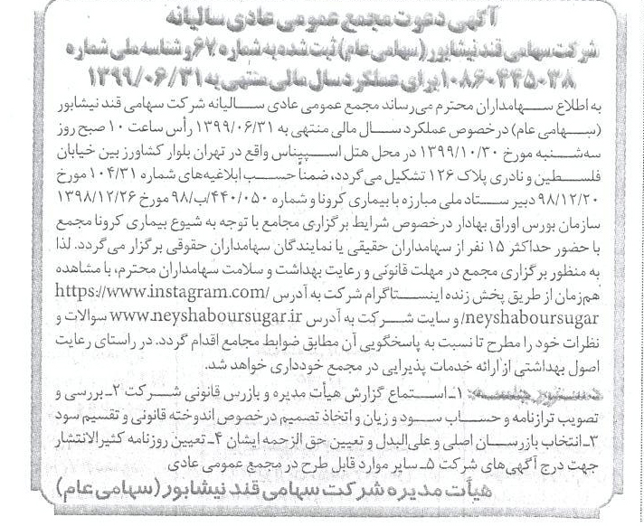 سهامداران - برگزاری مجمع عمومی سالیانه صاحبان سهام شرکت قند نیشابور در مورخه ۲۹ دیماه ۹۸