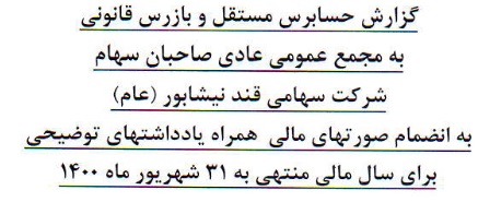 آگهی دعوت مجمع عمومی عادی سالیانه شرکت سهامی قند نیشابور (سهامی عام) برای عملکرد سال مالی منتهی به ۱۳۹۸/۰۶/۳۱ تصویر اصلی به پیوست می باشد