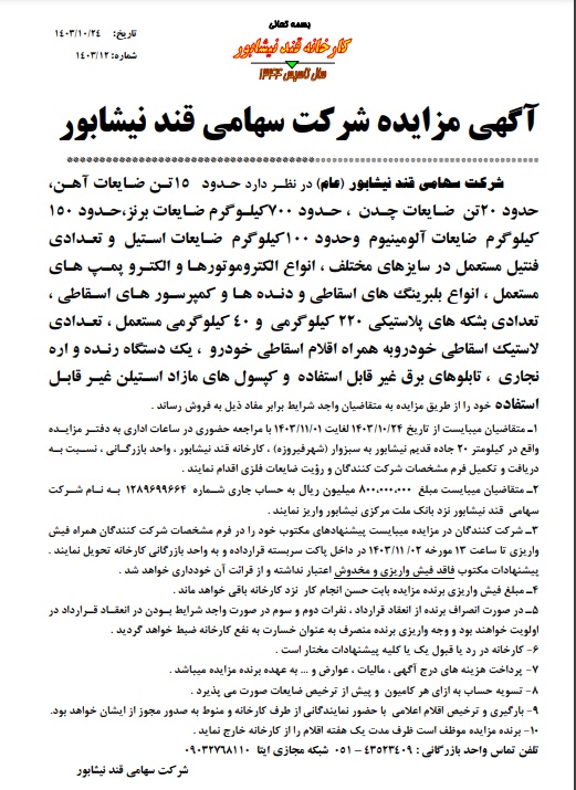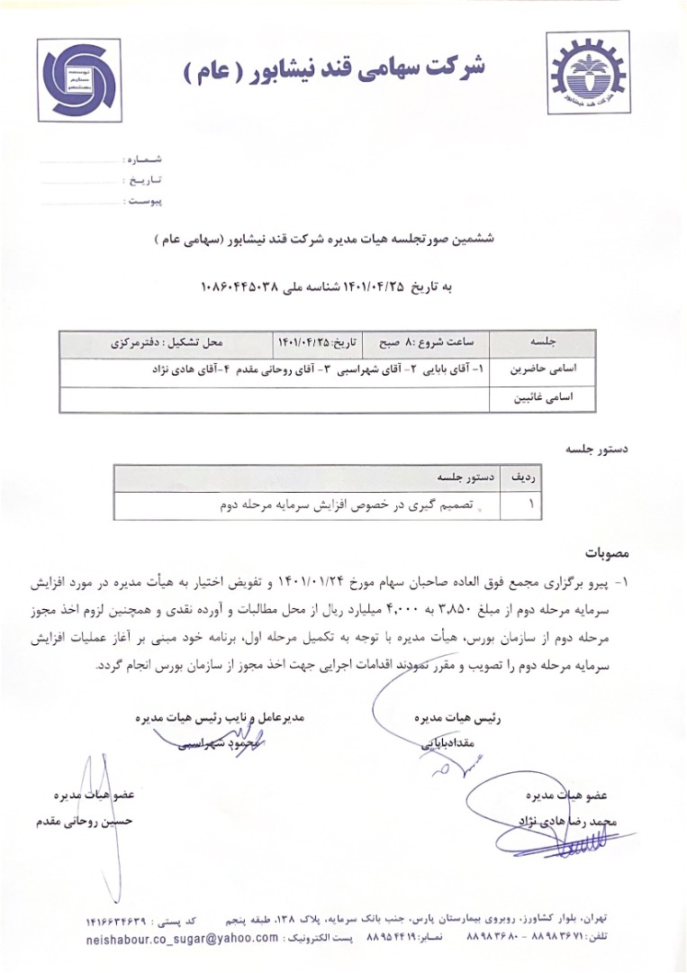 به نقل از روابط عمومی شرکت سهامی قند نیشابور مجمع عمومی صاحبان سهام شرکت قند نیشابور در تاریخ ۱۴۰۴/۱۰/۰۲ در محل انجمن صنفی کارخانجات قند و شرکت ایران در تهران برگزار گردید. در این جلسه، پس از استماع گزارش هیئت‌ مدیره و بازرس قانونی صورت‌های مالی سال منتهی به ۱۴۰۴/۰۶/۳۱ مورد