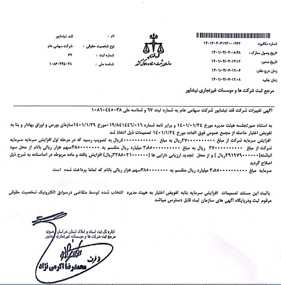 آگهی تغییرات شرکت قند نیشابور شرکت سهامی عام به استناد صورتجلسه مجمع عمومی عادی سالیانه