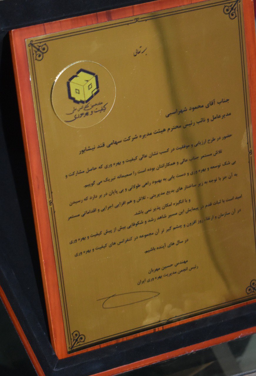 کارخانه قند نیشابور برند برتر مصرف‌کنندگان شد تندیس نشان ملی منتخب به حمید رشیدی تل گه اهدا گردید در هشتمین اجلاس نشان ملی منتخب مصرف‌کنندگان ایران، کارخانه قند نیشابور به‌عنوان برند برتر مصرف‌کنندگان معرفی شد و با اهدای تندیس، از حمید رشیدی تل گه ، مدیرعامل کارخانه قند نیشابور، تقدیر به‌عمل آمد.به